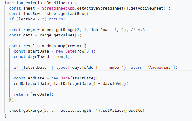 sheet.getRange(2, 5, tulemused.length, 1).setValues(tulemused);