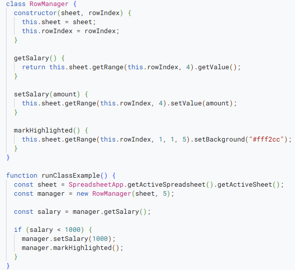 this.sheet.getRange(this.rowIndex, 1, 1, 5).setBackground(“#fff2cc”);